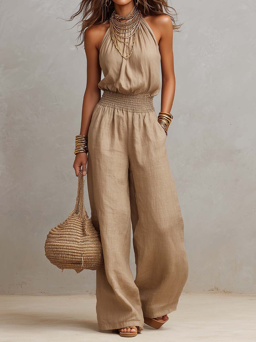 Made from lightweight material, this halter-neck jumpsuit is the ultimate must-have for warm weather. The item features a flowing halter top with a pleated bust, a smocked elastic waistband to accentuate your silhouette, and wide-leg pants with side pockets for necessary functionality. The natural tan color and textured fabric evoke a relaxed, bohemian vibe, perfect for sunny spring and summer days.
